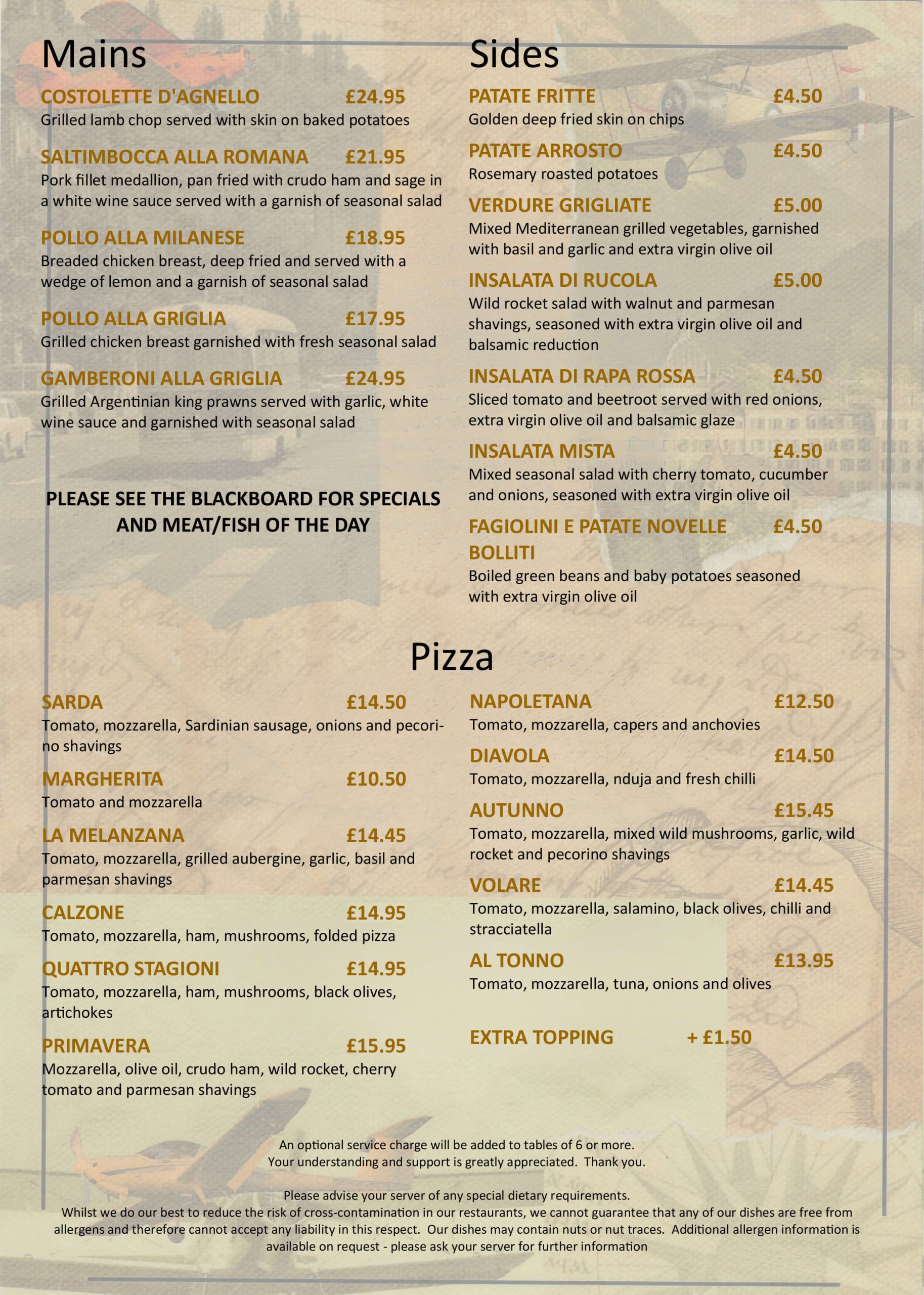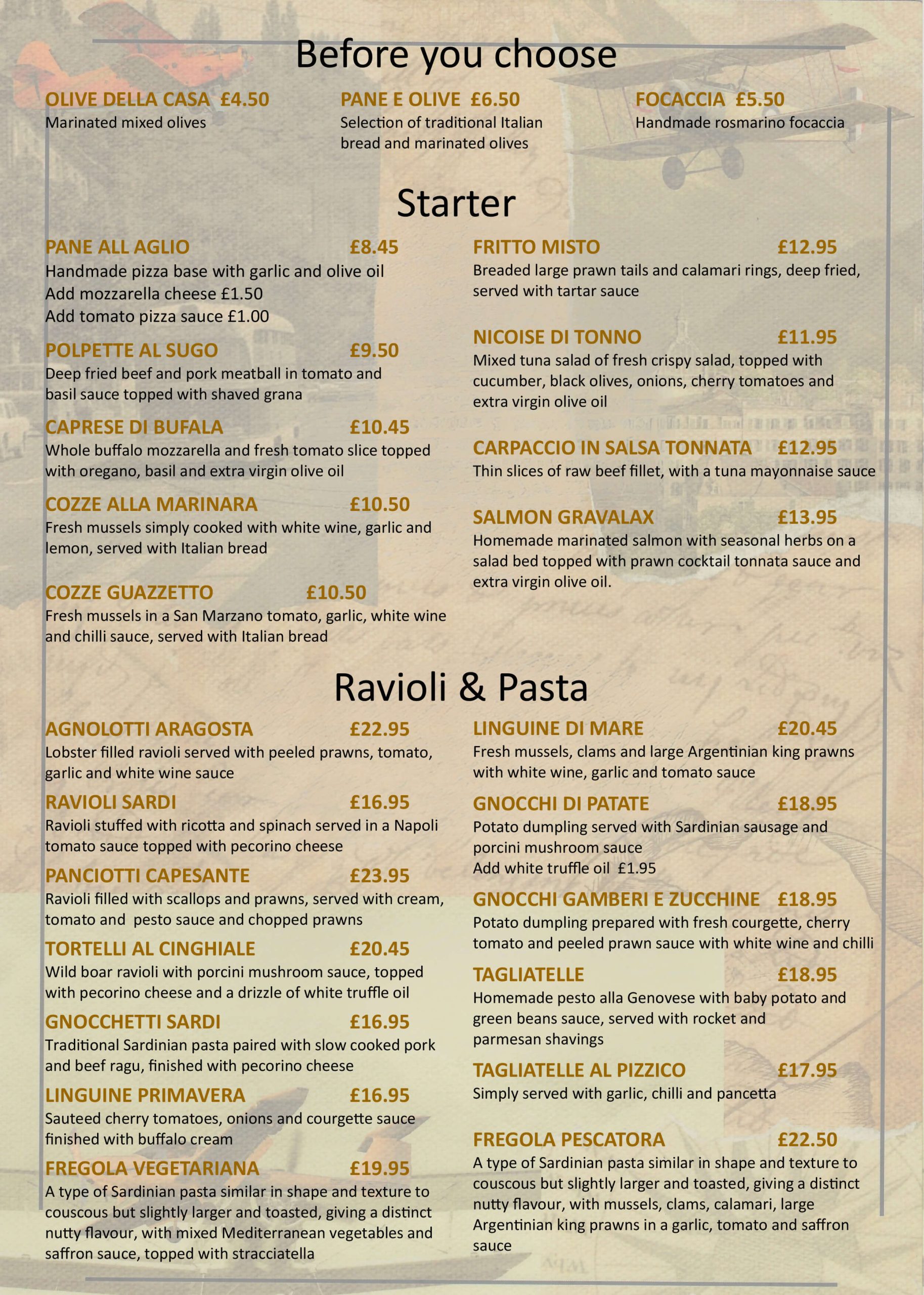 À la carteLunchBreakfast & BrunchAfternoon TeaKidsDessertDrinksÀ la carteLunchBreakfast & BrunchAfternoon TeaKidsDessertDrinksA la Carte Menu Enjoy Italian classics, choose from our starters and mains, ravioli, pasta, pizza and more! Make Reservation